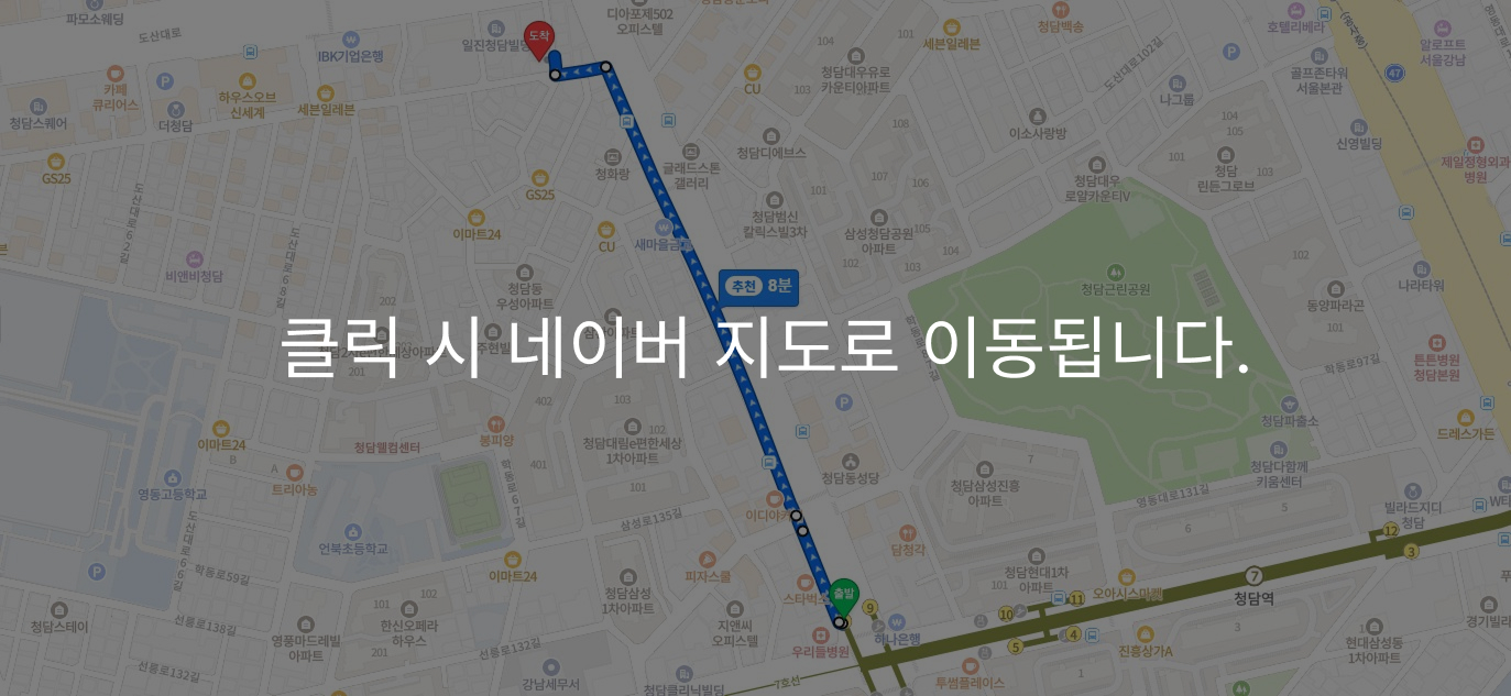 대중교통 : 지하철 7호선 청담역 8번출구(도보 6분) 자가 이용시 : 네비